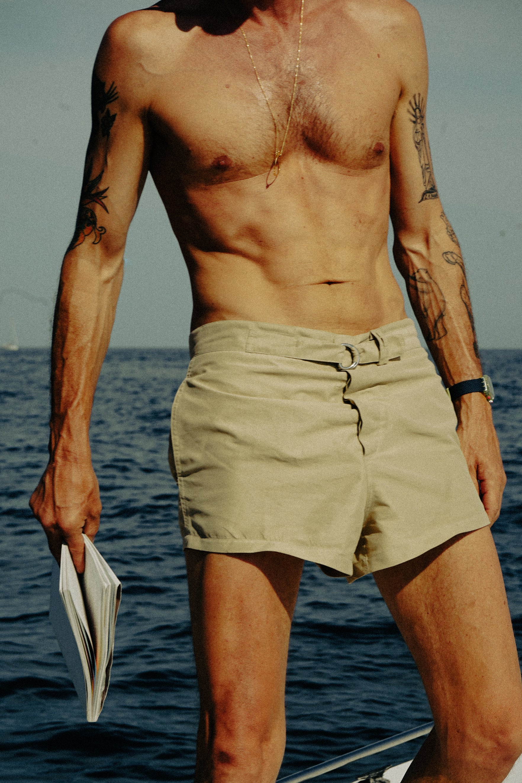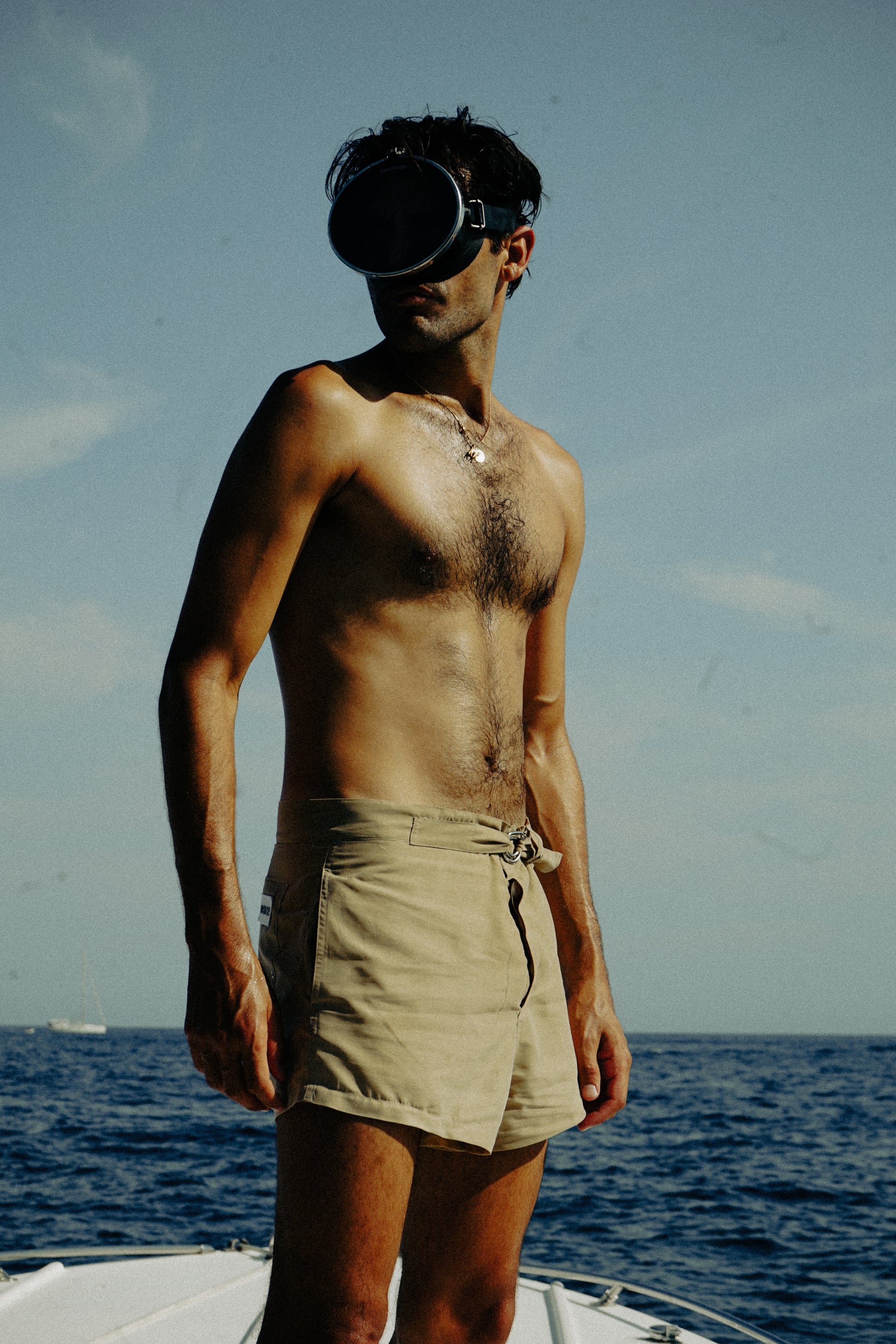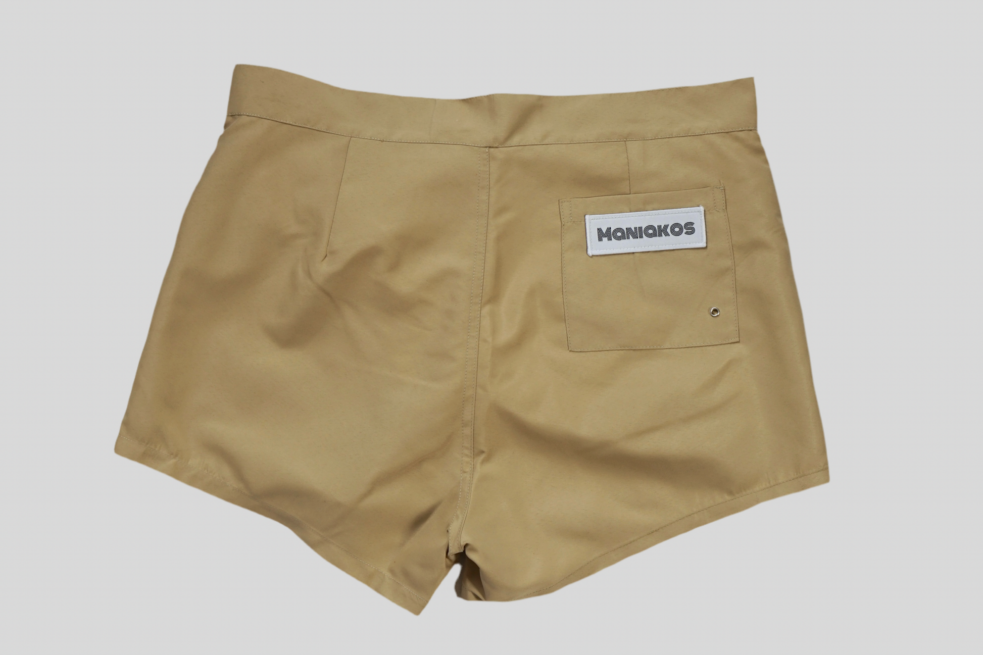 With its very lightweight recyclable polyester fabric, the Beige model is the most sporty of the MANIAKOS collection. The fabric has a slightly brushed aspect, similar to the original swim trunks which were in cotton. The fabric also tends to wrinkle when dry, which gives it a very cool vintage touch when worn "hard".